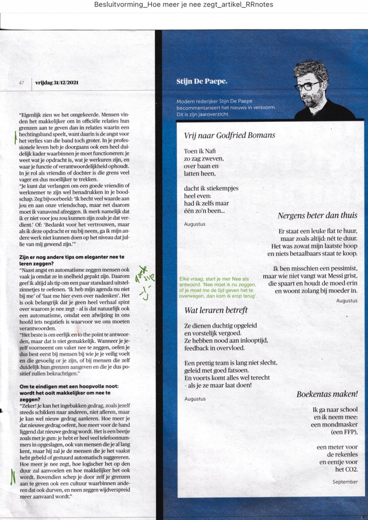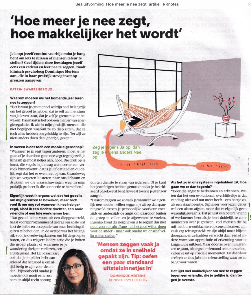 En dan: ‘Hoe meer je nee zegt, hoe logischer het op den duur zal aanvoelen en hoe makkelijker het ook wordt’. Dat ga ik eens proberen!