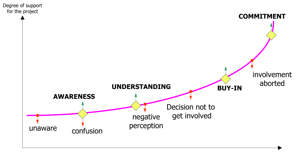 Het lijkt me dat je dit model kan gebruiken en een stip zetten op waar je denkt dat de medewerkers zitten in hun bereidheid aan de strategie mee te werken. Door interviews kan je daar achterkomen. Maak het niet te ingewikkeld zou ik zeggen, het model is slechts een indicator.