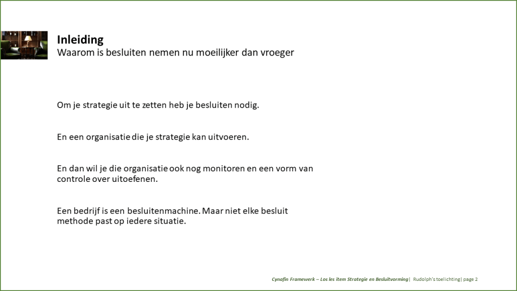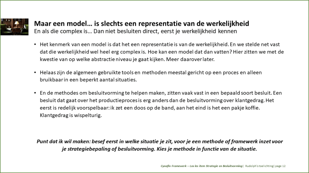- Heb je zicht in welke domeinen van het Cynefin model jouw organisatie vaak besluiten moet nemen? En hoe acteer je daar zelf in? (Doel: Begrip van hoe het model kan worden toegepast op jou en je omgeving)
