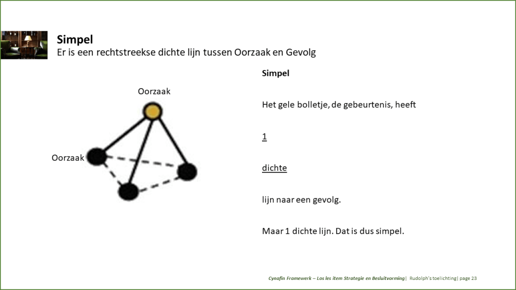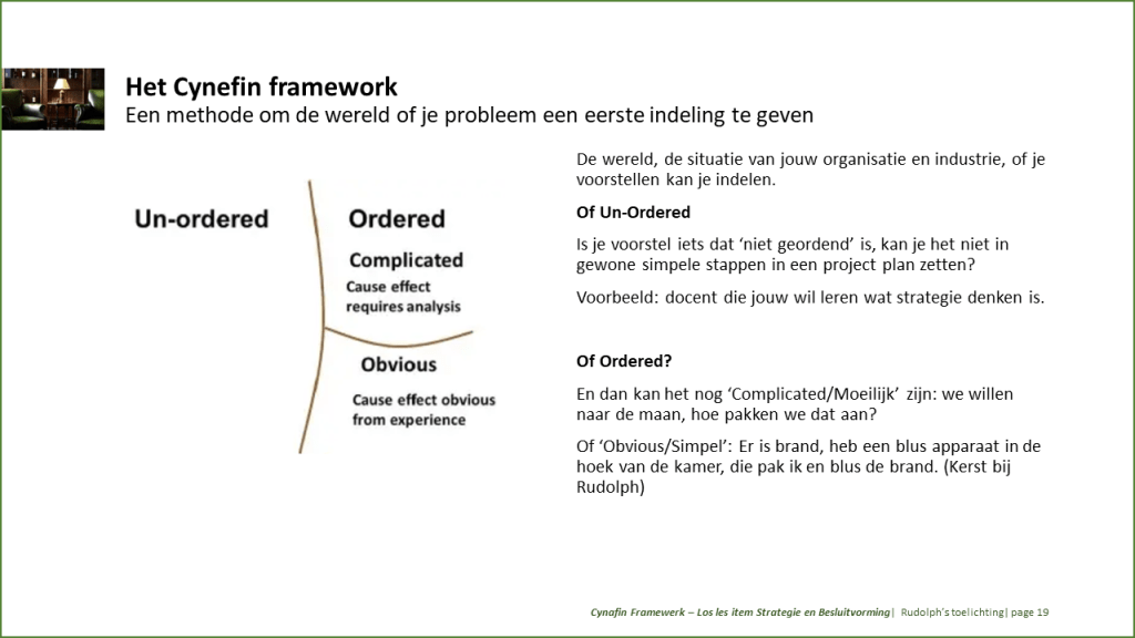 - Kun je elk domein van het Cynefin-model kort uitleggen en een concreet voorbeeld geven het liefst in jouw organisatie verband? (Bijvoorbeeld: Wat is een voorbeeld van een complex probleem versus een gecompliceerd probleem?)