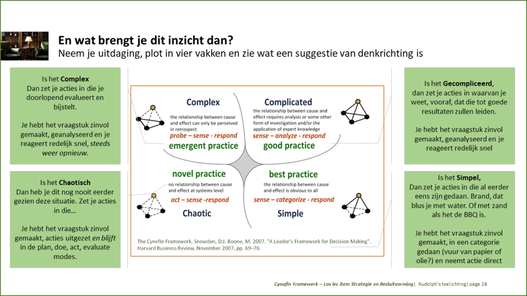 - Hoe helpt het Cynefin-model je om betere beslissingen te nemen in onzekere of veranderlijke situaties? (Doel: Test of jij de praktische waarde van het model begrijpt/’gekocht’ hebt.)