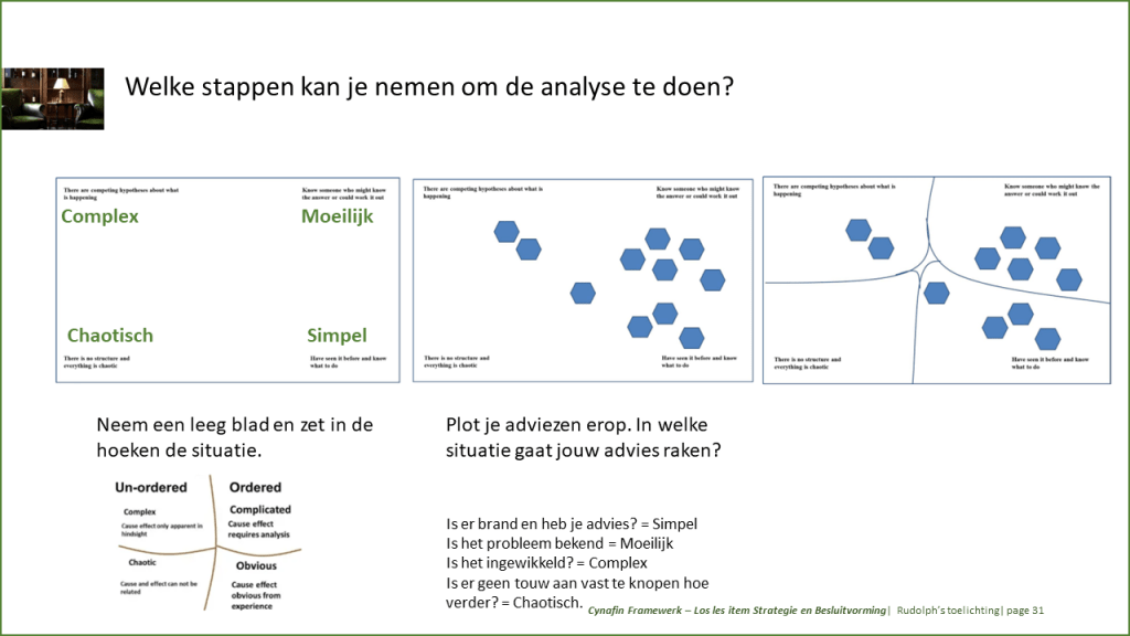- Hoe kun je anderen in een organisatie helpen om situaties juist te classificeren volgens het Cynefin-model? (Doel: Begrijpen hoe jij het model kan overgebrengen op anderen, essentieel om besluiten in je juiste vorm te krijgen.)