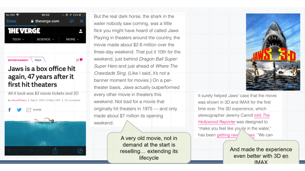 Je product of dienst voorziet in een behoefte. Als je er van uitgaat dat die behoefte veranderd door de jaren heen, kan je denken dat al je jouw product aanpast aan die verandering, je product actueel blijft. Zoals het voorbeeld van de film met de haai, Jaws. Die heel oud is, maar in 3D weer populair. Van 2D is de behoefte veranderd, men ziet graag 3D met eventueel ook geur en bewegende stoelen in de bioscoop. Pas je daarop aan en je verkoopt een heel oude film weer als nieuw. Meer voorbeelden zitten onderaan deze pagina.