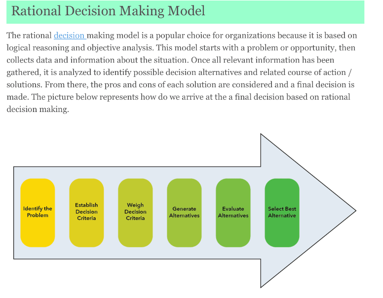 Voorbeeld 1. Rationele besluitvorming. De Rational Decision-Making modellen, en alle daaraan gelijkende modellen zijn een systematische, stapsgewijze benadering van het besluit nemen op rationele basis. Het gaat ervan uit dat individuen beslissingen nemen door alle relevante alternatieven te verzamelen en te evalueren. Dan de gevolgen in overweg te nemen. En dan te besluiten voor de optie met het hoogste nut.