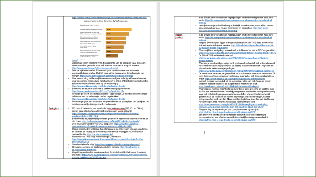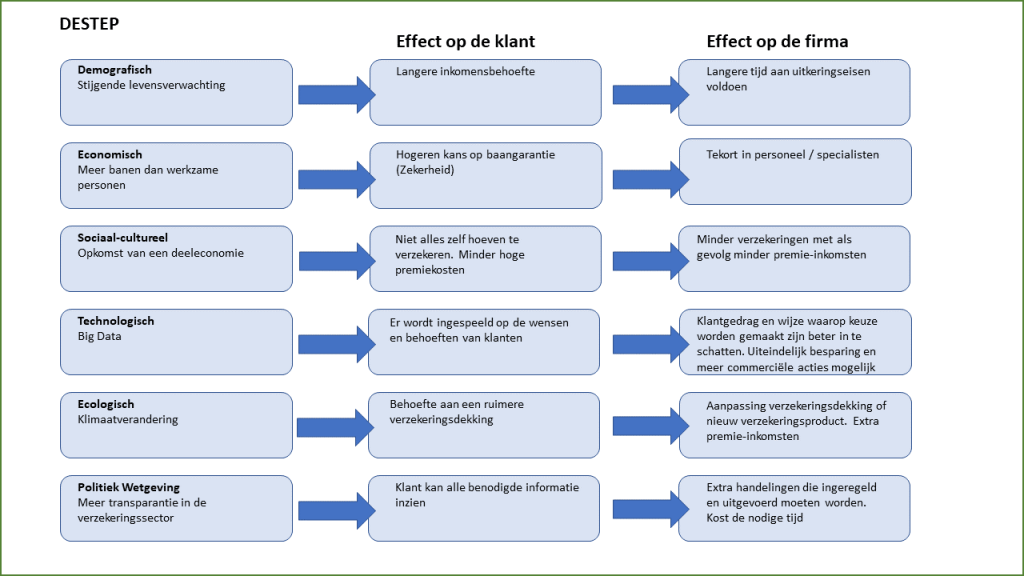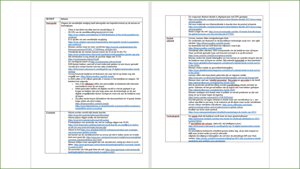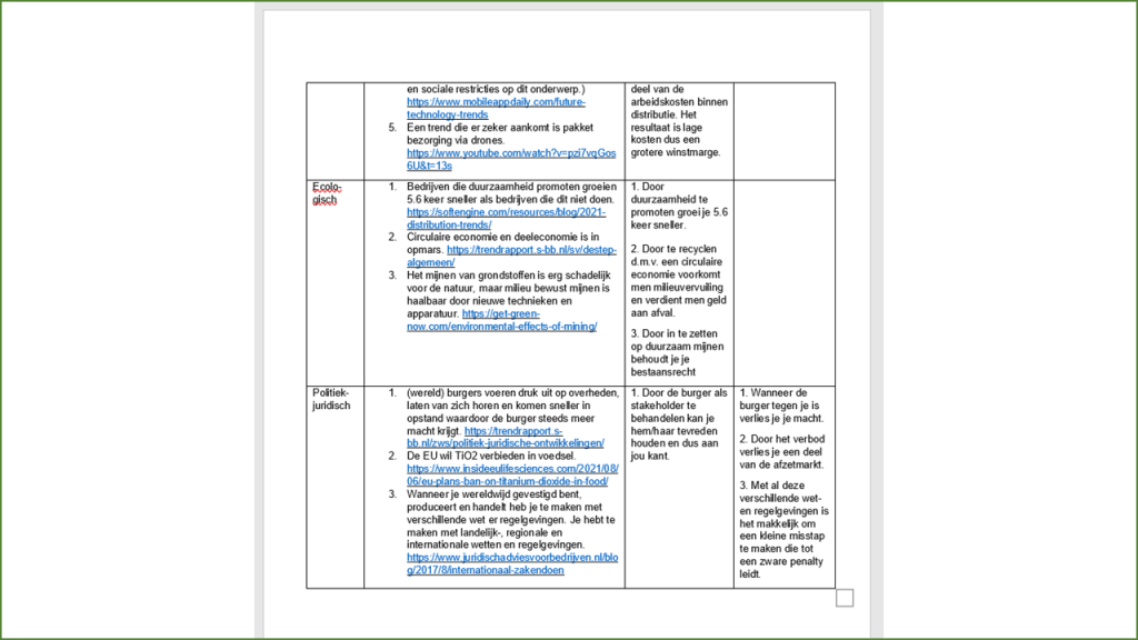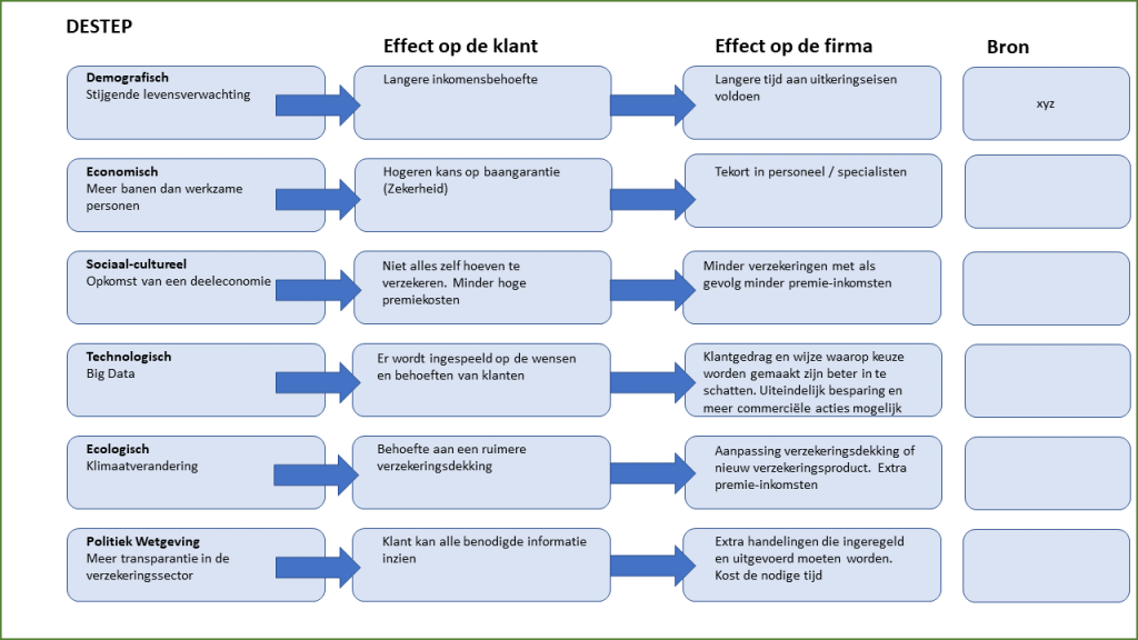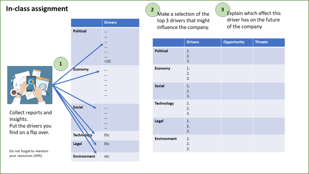 De bekende letters om je externe analyse te doen. Je loopt de letters af, zoekt er drivers in, bedenkt welke effecten het op de firma kan hebben en wie de meeste impact heeft. Makkelijk te zeggen maar een berg met werk. Probeer je er niet snel, snel vanaf te maken.