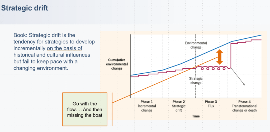 b) Als er eigenlijk niet veel concurrentie is.. dan kan je in slaap gaan vallen. JE denkt dat je monopolist bent. Dat is gevaarlijk, bij Kodak van de fototoestellen dachten ze dat ook. Drift noemen ze dat in het Engels. Je ziet dat bij veel firma’s.