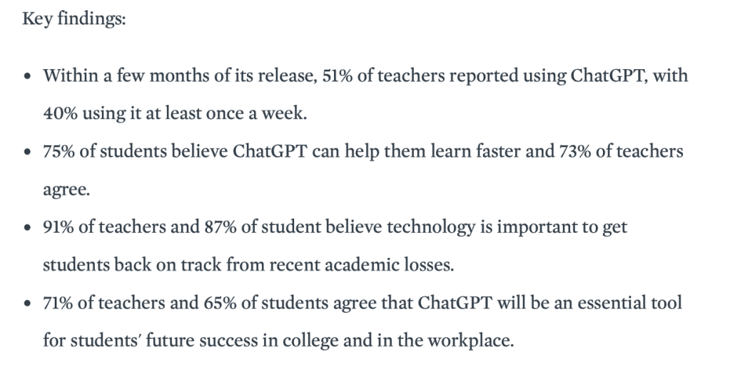 Als vorig jaar in de lagere en middelbare scholen in Amerika al heel veel leerlingen en docenten AI gebruiken, (zie report van de Walton Foundation) dan kan je als volwassenen niet achter blijven. Als wel, ga je heel snel ingehaald worden. Dus ik denk dat we vol moeten inzetten op het gebruik van AI in de module Reputatie bouwen en onderhouden. Ook omdat het een 4e jaars module is, waar jij als student al snel de springplank naar een nieuwe baan mogelijk gaat nemen.