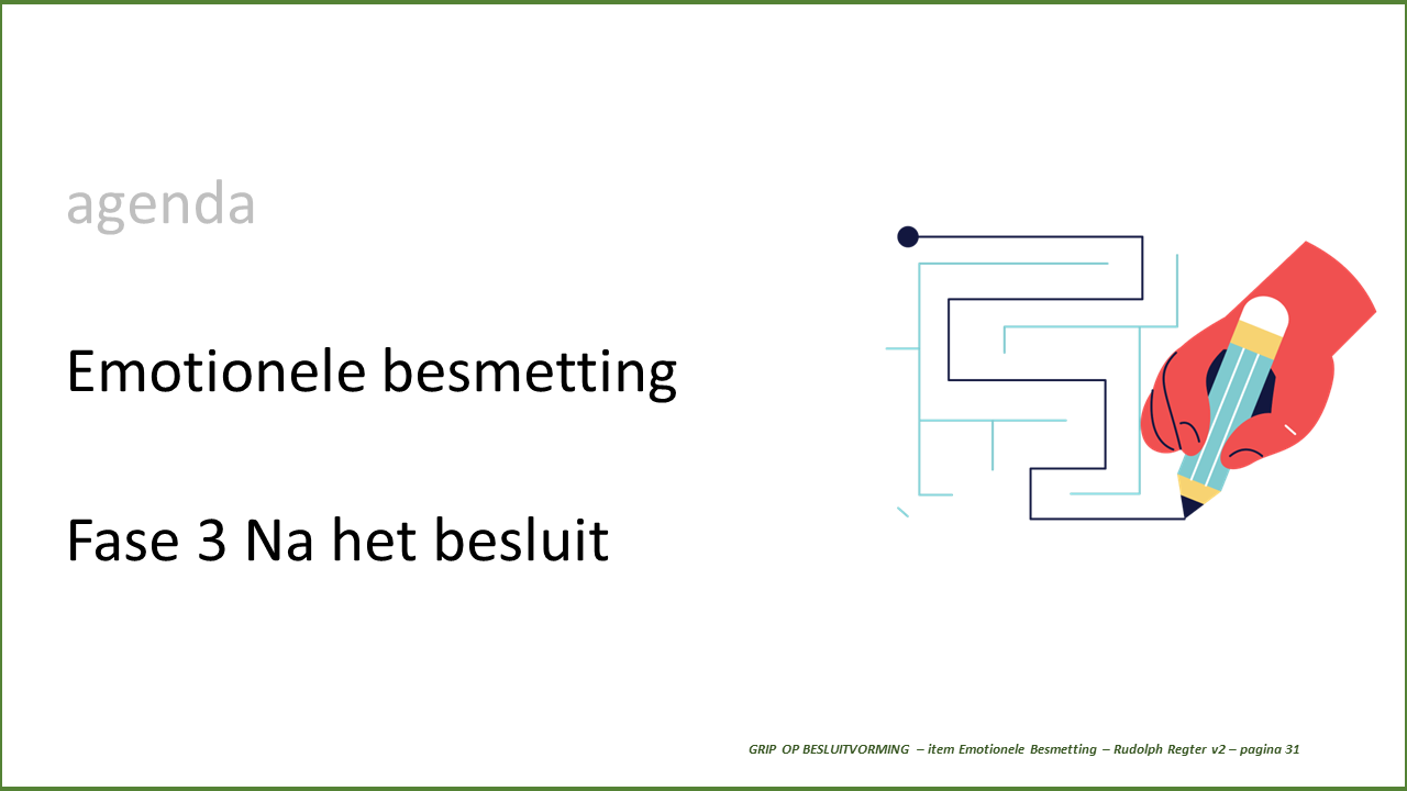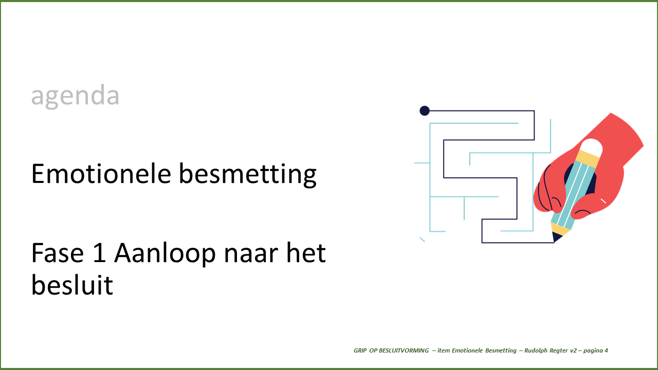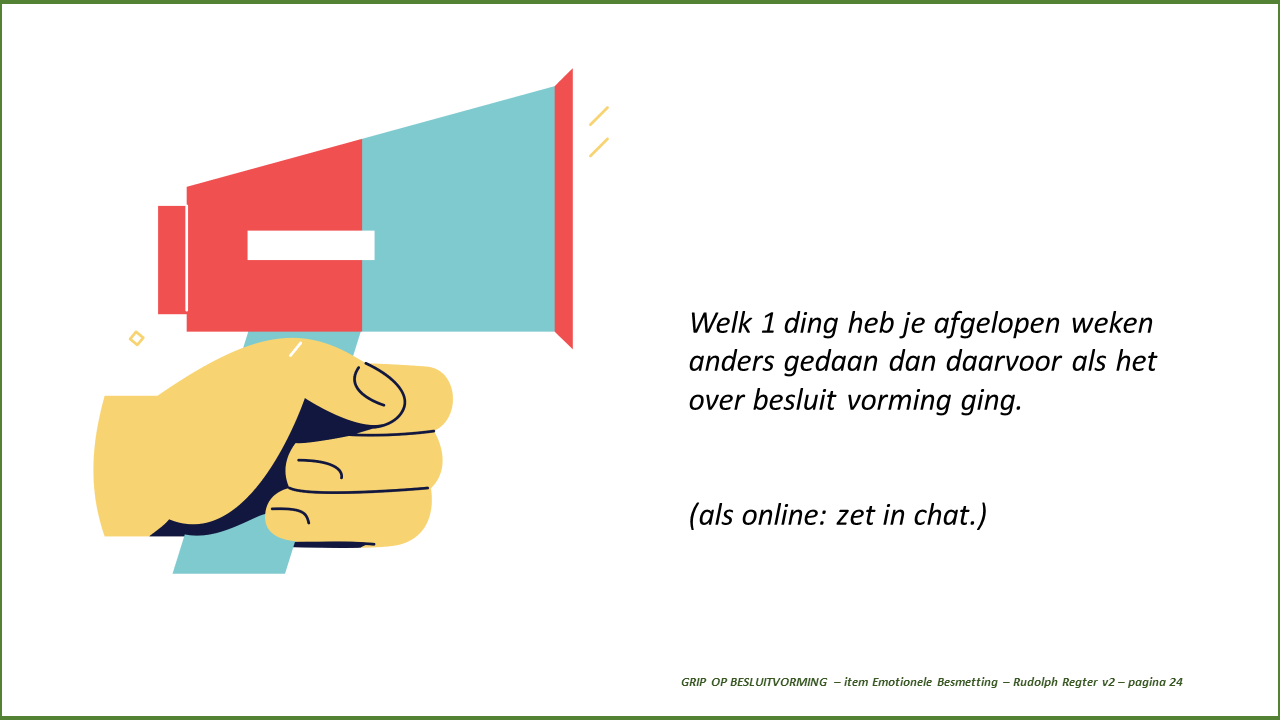 Als je een besluit moet nemen, ben je wellicht vooraf zenuwachtig of voel je een spanning. Dat kan natuurlijk ook zo bij de anderen zijn die meedoen in de besluitvorming. Hoe heeft dat invloed op mekaar en hoe kan je dat gebruiken? Je bent zelf een onderdeel van het besluit en ook de ander. Hoe kan je daarin jezelf helpen op een goede wijze tot een besluit te komen en hoe help je, of stuur je, anderen? Hieronder de slides die ik gebruikte om daar wat richting aan te geven.