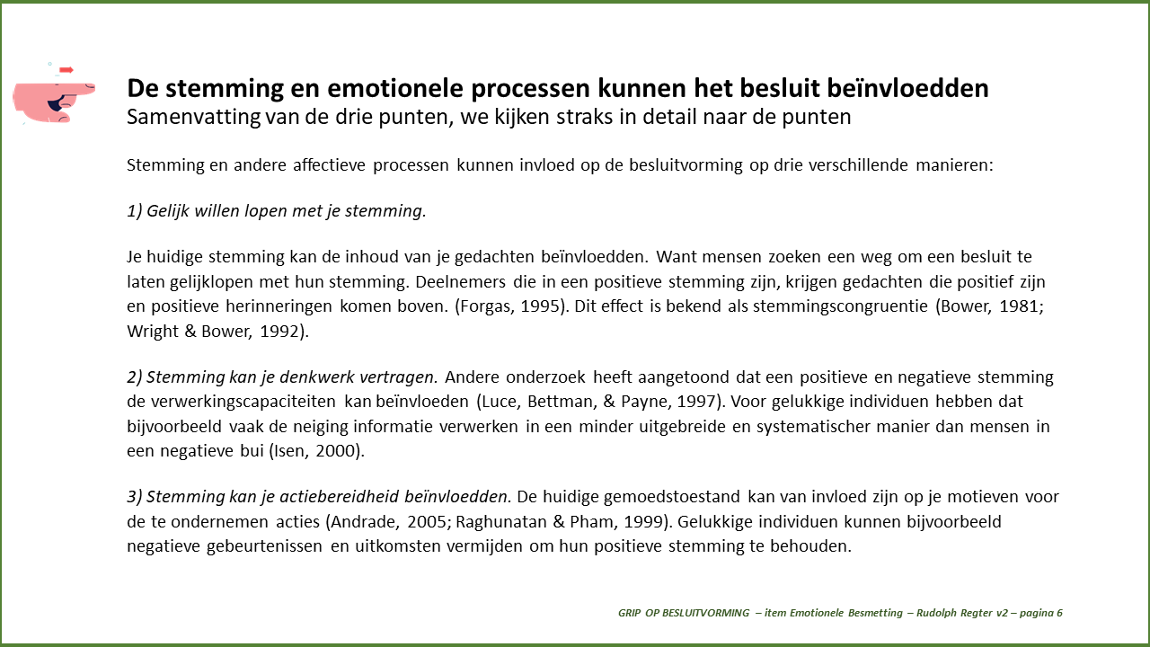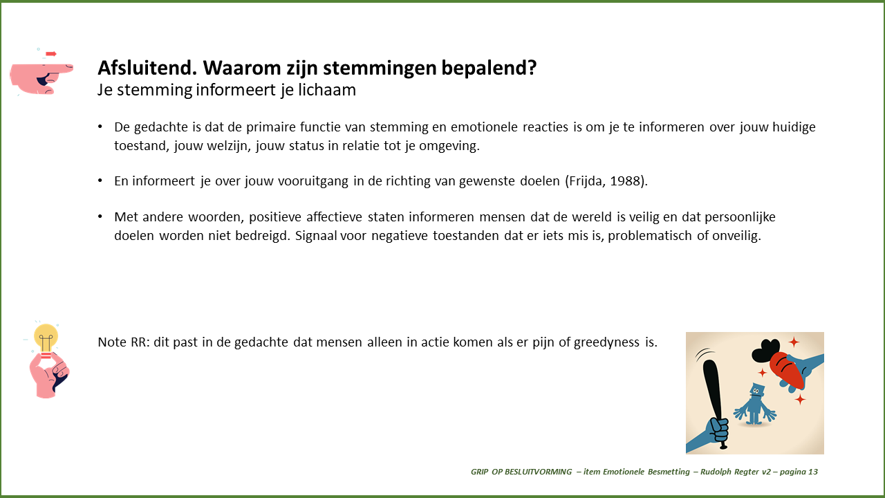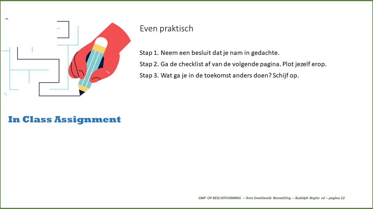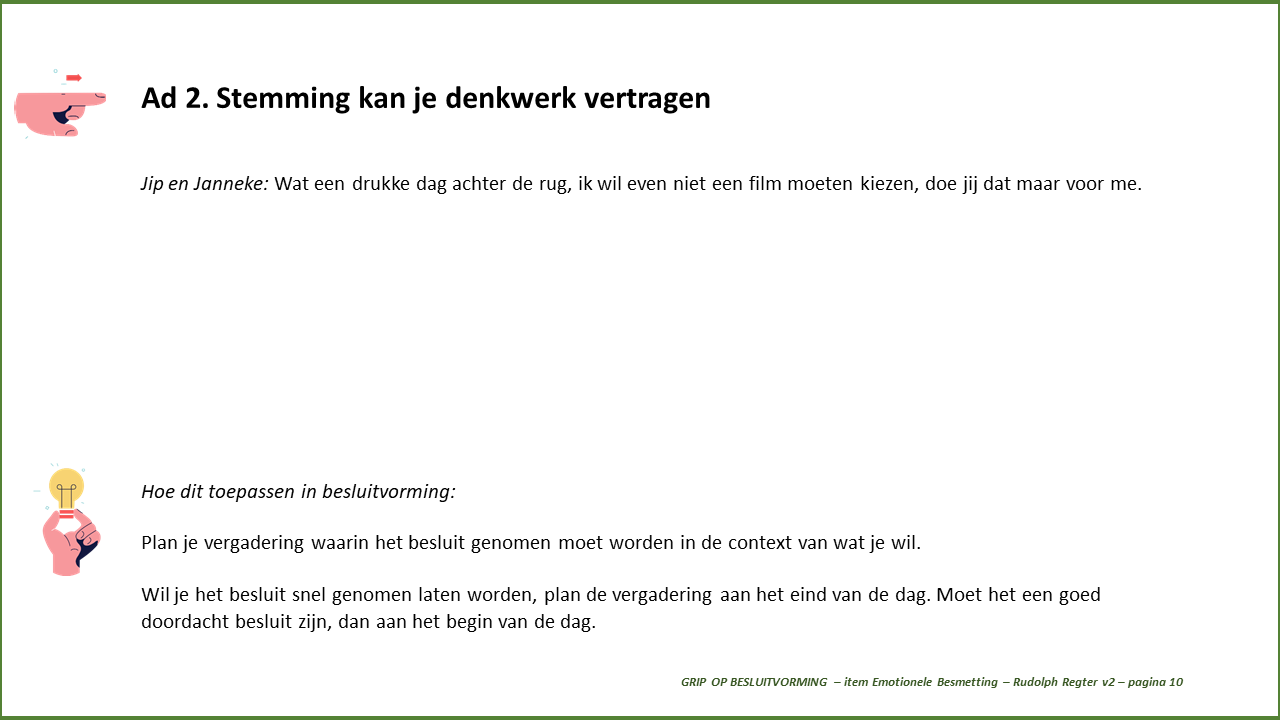 Als je een besluit moet nemen, ben je wellicht vooraf zenuwachtig of voel je een spanning. Dat kan natuurlijk ook zo bij de anderen zijn die meedoen in de besluitvorming. Hoe heeft dat invloed op mekaar en hoe kan je dat gebruiken? Je bent zelf een onderdeel van het besluit en ook de ander. Hoe kan je daarin jezelf helpen op een goede wijze tot een besluit te komen en hoe help je, of stuur je, anderen? Hieronder de slides die ik gebruikte om daar wat richting aan te geven.